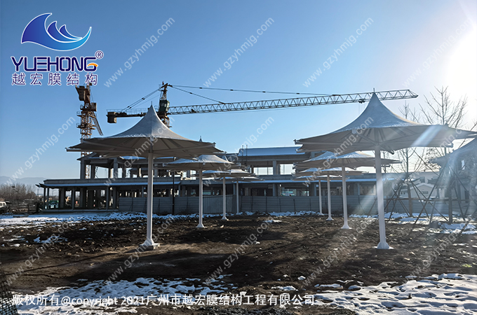 景觀膜結構是一種依托柔性膜材與預應力結構構建的建筑體系,通過張力自平衡實現輕質大跨空間覆蓋。其采用透光率10%-15%的涂層膜材,景觀膜結構適合很多場景,與傳統建筑相比,景觀膜結構更貼近生活中需要的一種建筑美感,功能性、耐用性強、滿足景區需要的遮陽遮雨場地。營造活動空間的功能,提升了環境品質和舒適度。